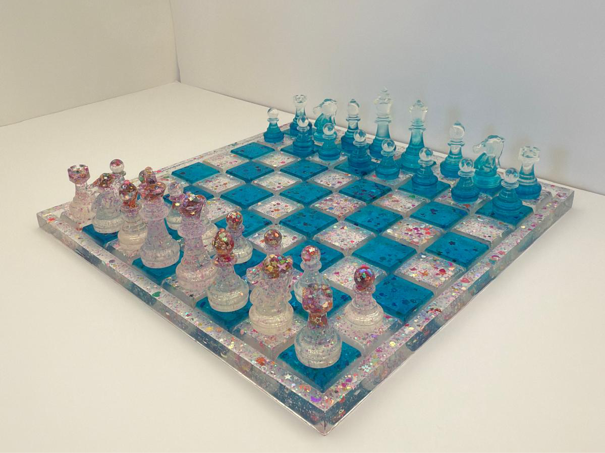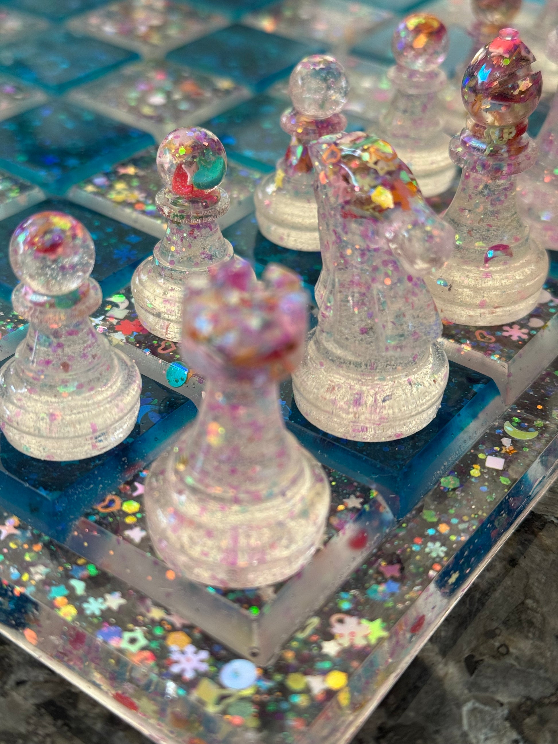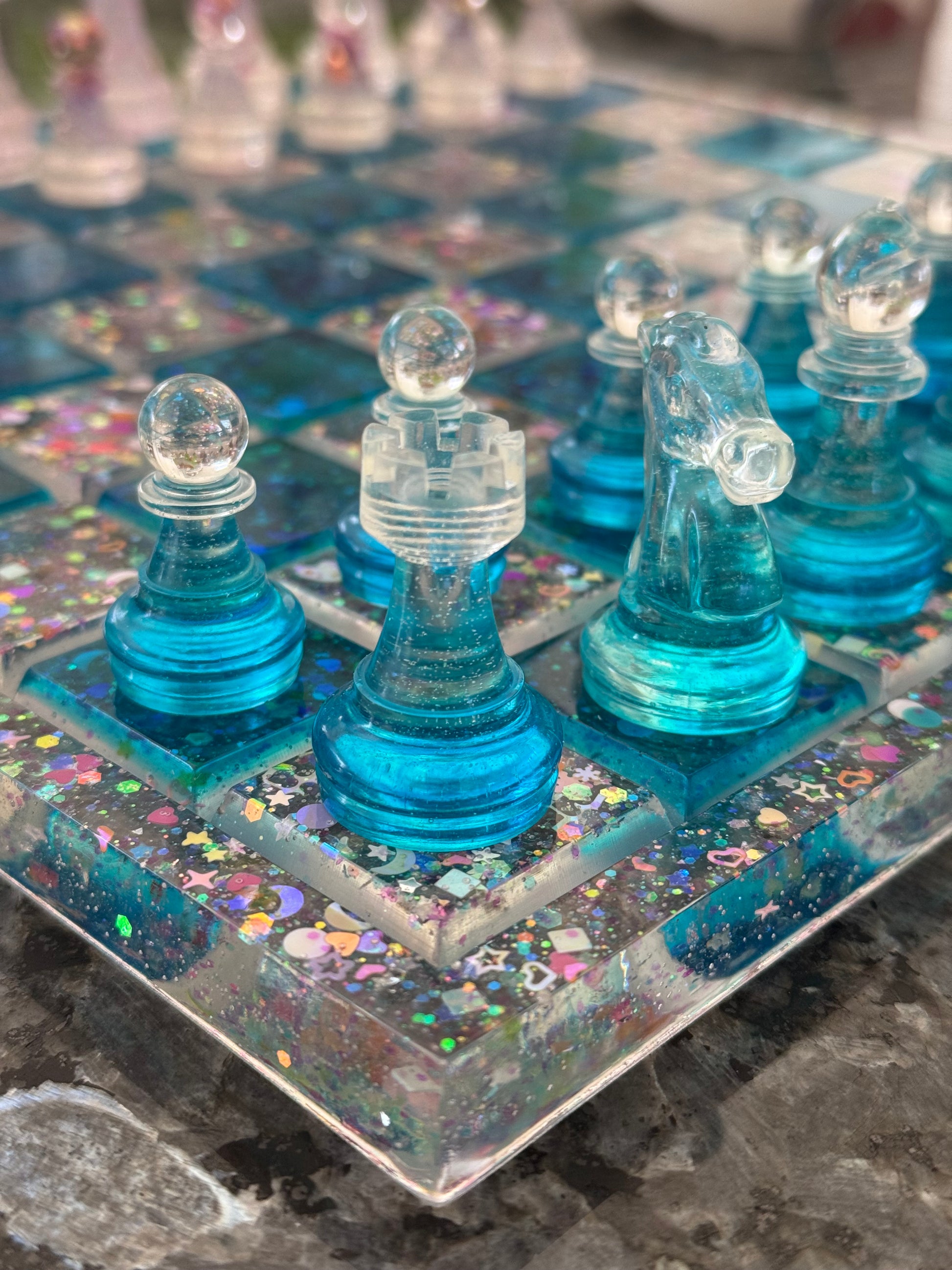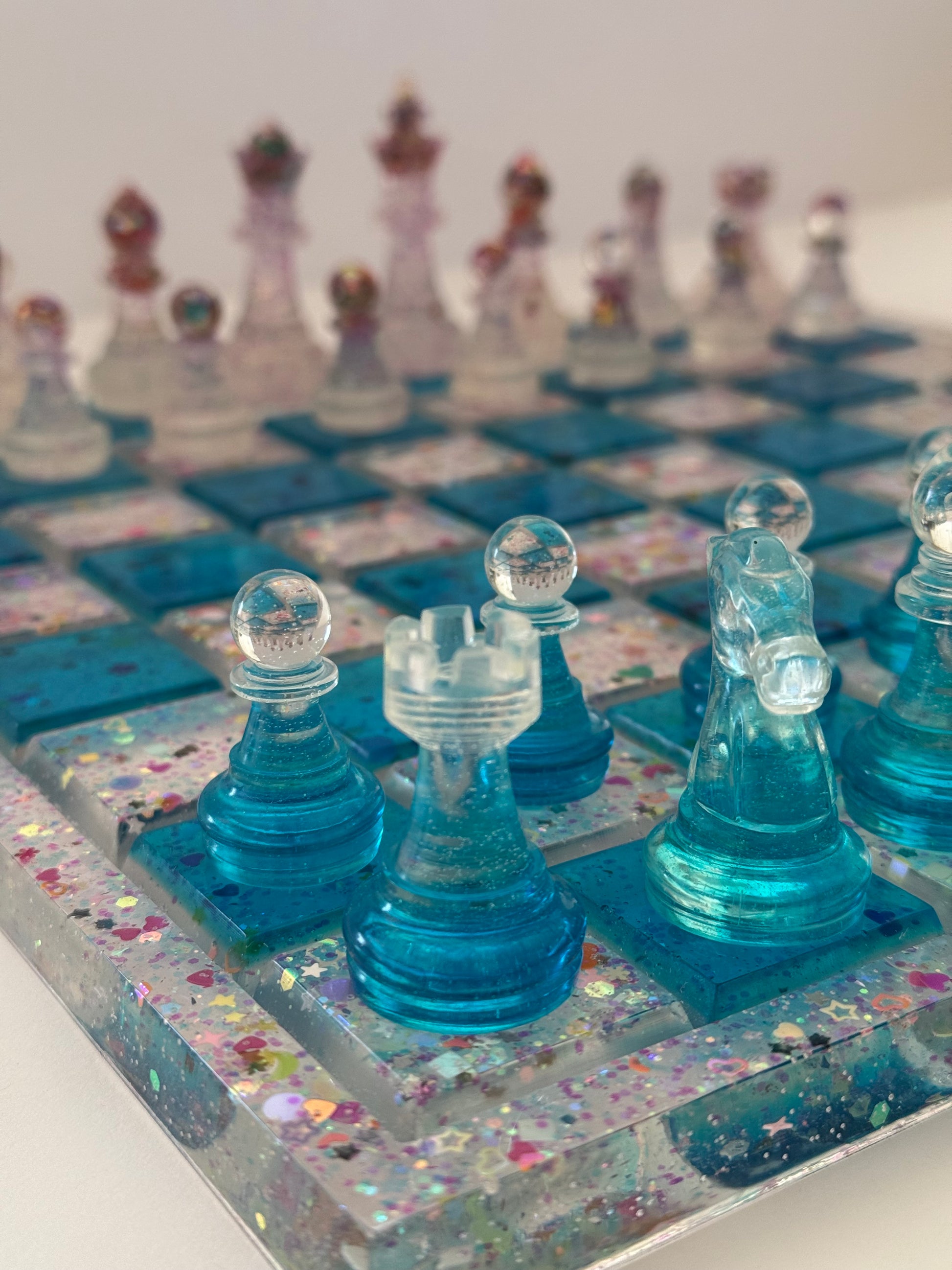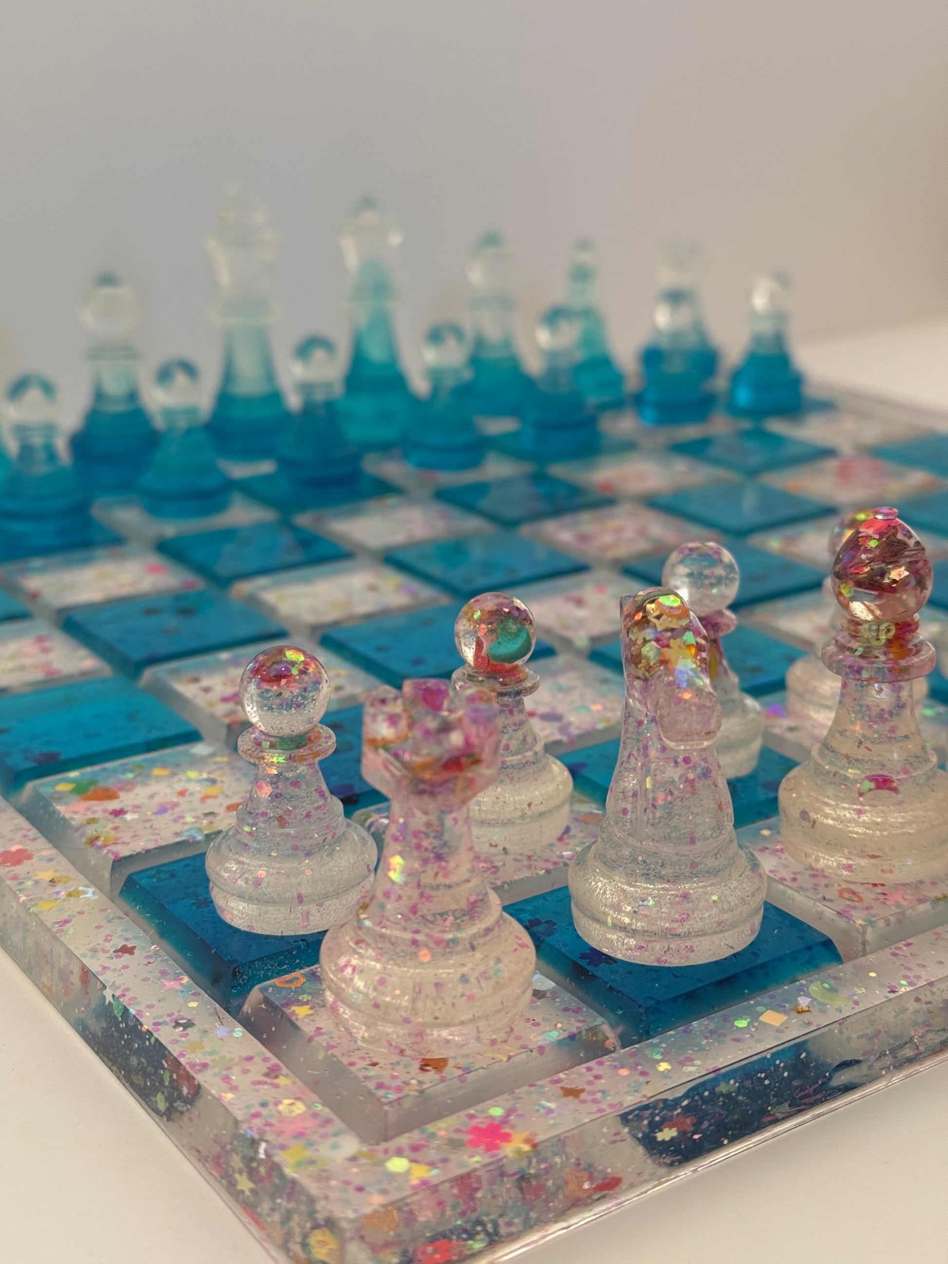 Step into a dreamy galaxy of sparkles and strategy. The orbit Dream chess set blends icy blues with ethereal glitter pastels in a handcrafted resin design full of shimmer, detail, and intention.