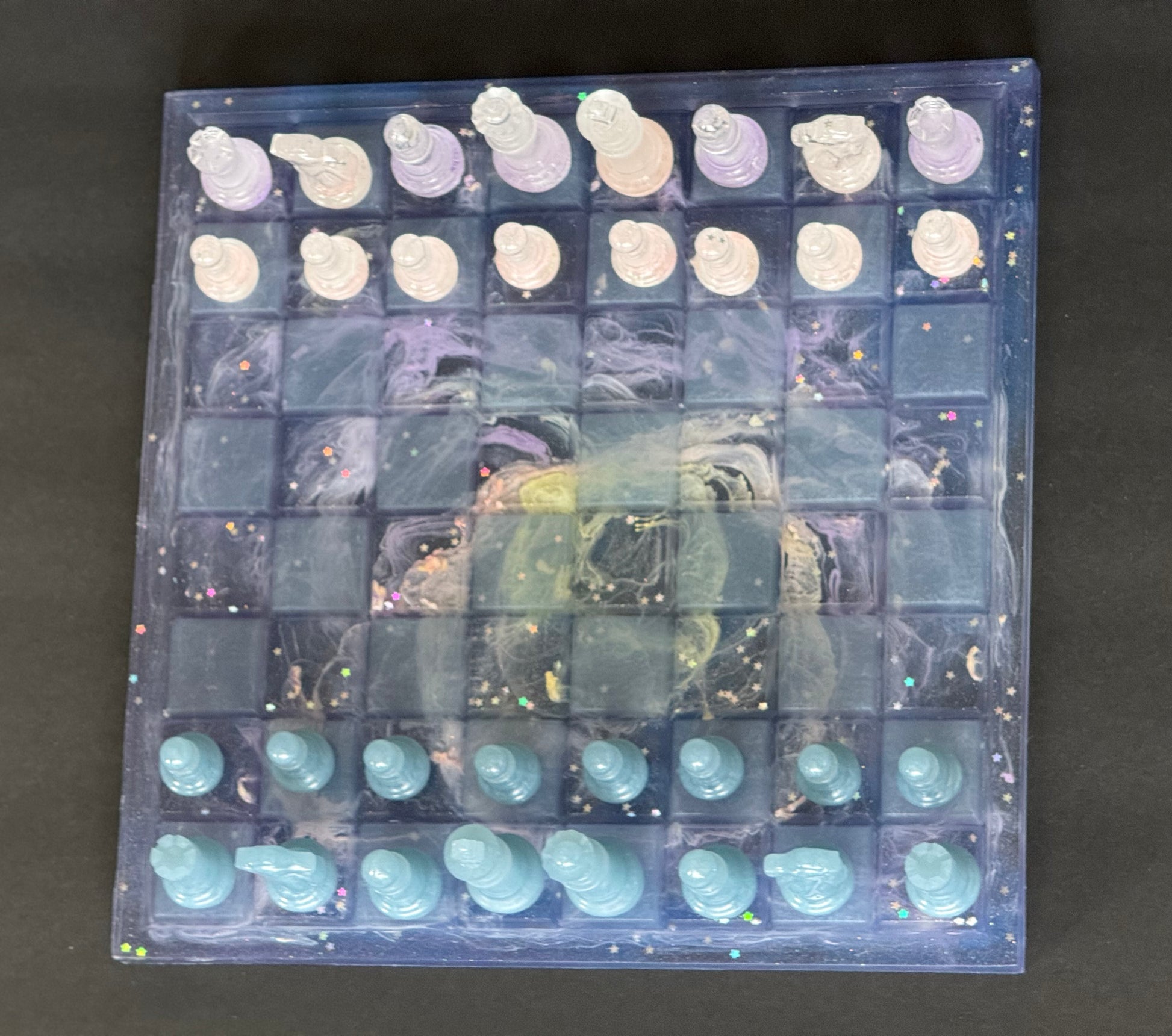 Step into the stars with Orbit Dream, a handcrafted resin chess set inspired by the quiet beauty of distant galaxies. Each square swirls with dreamy shade of indigo, lavender and cosmic pearl-accented by subtle sparkles that mimic drifting stardust.