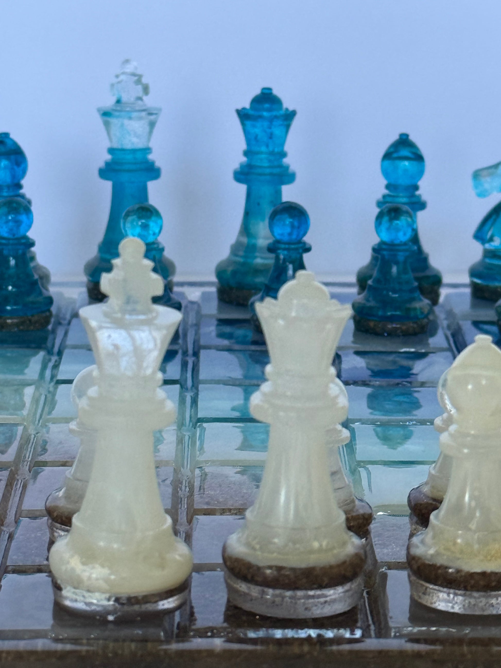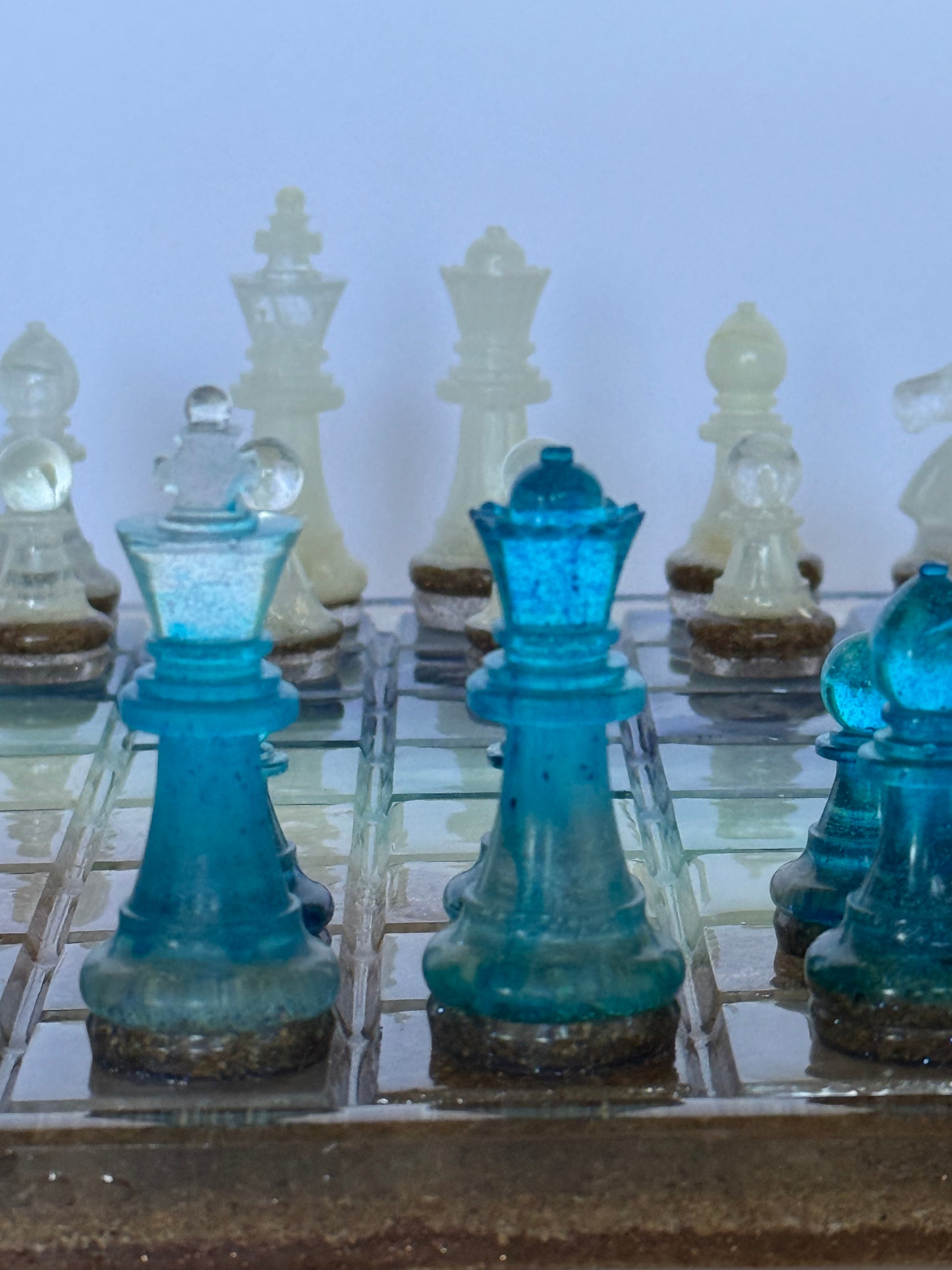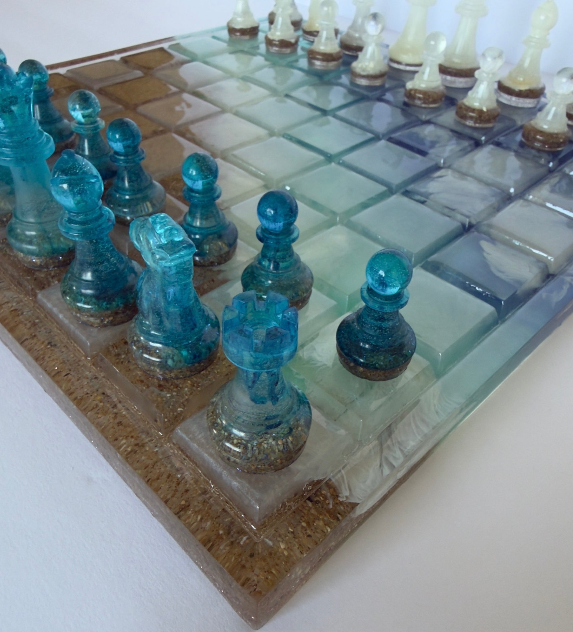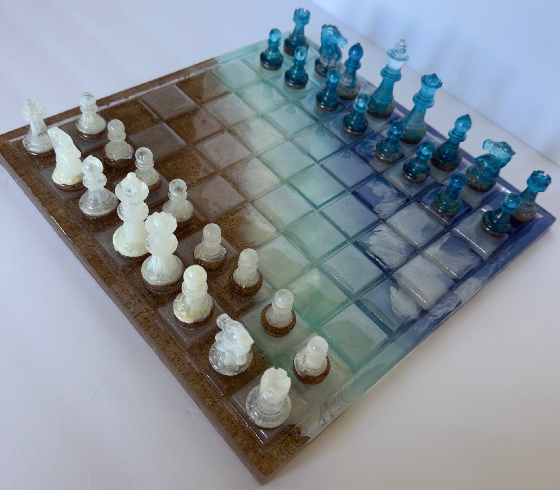 - Coodinating beach-inspired chess pieces (Pawns to Kings) sealed with crystal-clear UV resin for durability